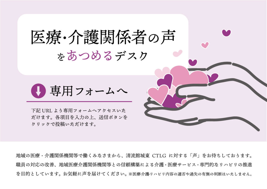 地域の医療・介護関係機関等で働くみなさまから、清流館城東CTLGに対する「声」をお待ちしております。職員の対応の改善、地域医療介護関係機関等との信頼構築による介護・医療サービス・専門的なリハビリの推進を目的としています。上記専用フォームより、お気軽に声を届けてください。※医療・介護リハビリ内容の適否や過失の有無の判断はいたしません。